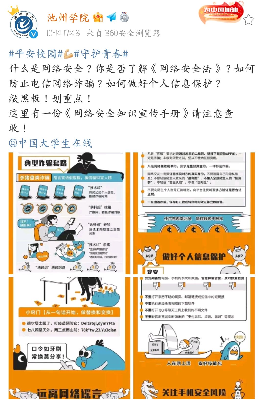 本次讲座是我校2021年网络安全宣传周系列活动之一。除专题讲座外,校党委宣传部、学生处、团委、网络与信息化管理处、各二级学院通力合作,开展形式多样、内容丰富的网络安全主题教育活动。学校利用电子屏、微信公众号等媒体平台集中宣传网络安全知识,开展网络安全微视频、微网文作品征集活动,各班级召开网络安全主题班会以及开展自愿签名活动等。学校多措并举,积极增强广大师生的网络安全意识,提升网络安全防护技能,营造健康文明的校园网络环境。