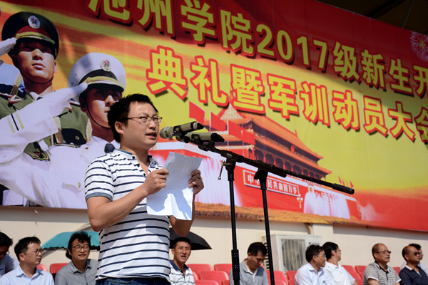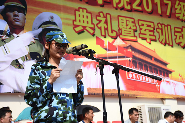教职工代表许业军结合自己六年工作经验勉励新生提高自身修养,做一个有理想有追求的人;文学与传媒学院2014级汉语言文学专业王乐笙同学代表全体老生向新生提出四项祝愿,祝愿大家生活好、学习好、友情好和态度好,在初来乍到之时克服生活上的差异,在各项活动中锻炼能力;数学与计算机学院2017级经济统计专业王丹同学作为新生代表在发言中表示将转变角色、调整心态,迎接美好的大学生活。紧接着军训团团长周鹏在发言中表示,军训是同学们大学生活的前奏,希望同学们在接触部队生活中挑战自我,增强体魄,成为有理想、有道德、有文化、有纪律的高素质复合型人才。