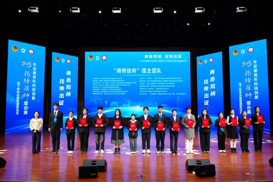 12月7日至8日,由共青团安徽省委员会、安徽省教育厅、安徽省科学技术协会、安徽省社会科学院、安徽省学生联合会主办的2025年度安徽青年科技创新“揭榜挂帅”擂台赛线下终审决赛成功举办。本届赛事共发布66个榜题,吸引了来自全省42所高校的391支优秀团队同台竞技。我校选报作品荣获一等奖3项,取得参加该项赛事以来的最好成绩。