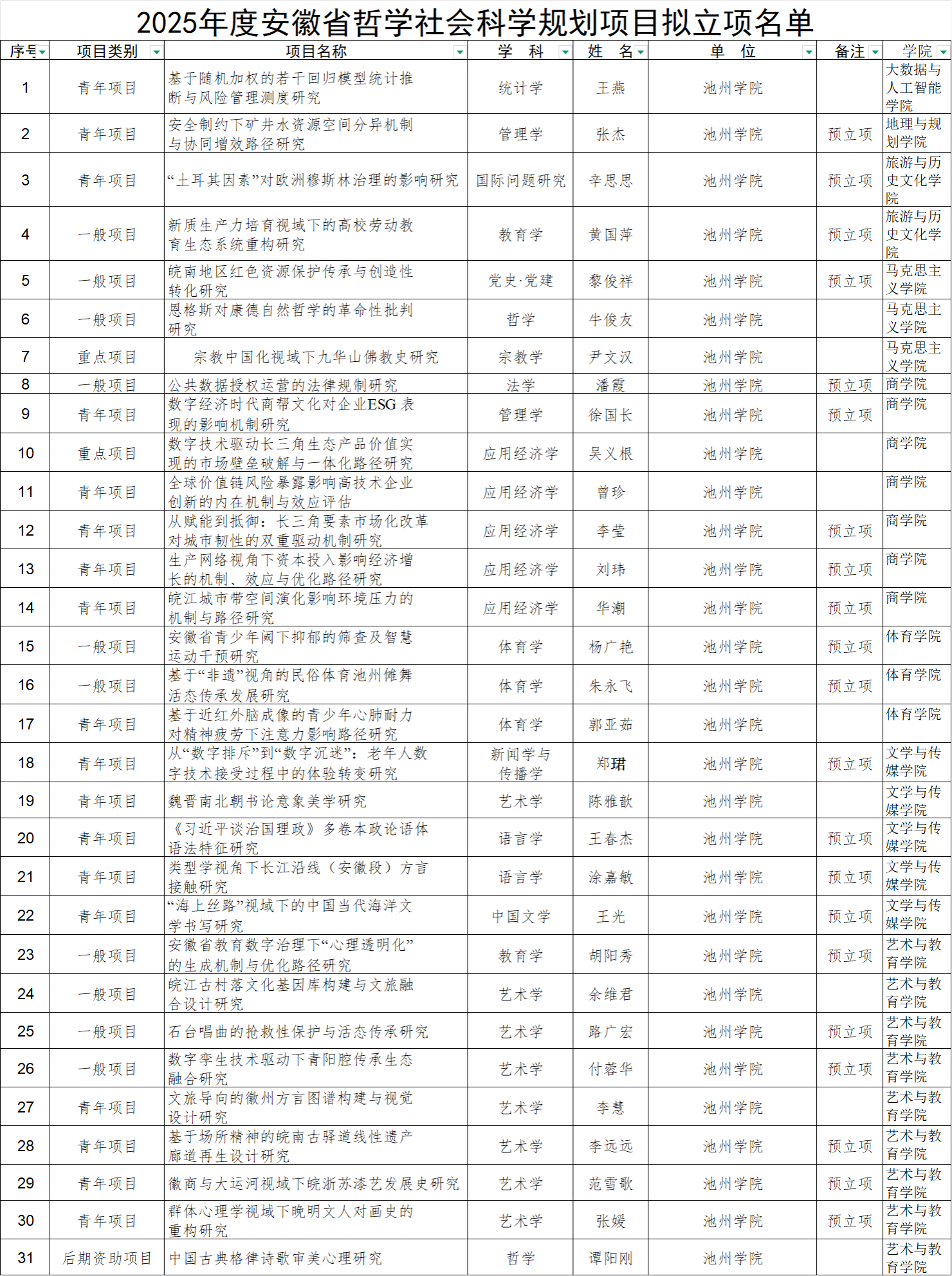 本次立项涵盖艺术学、经济学、管理学、教育学、体育学等十余个学科,展现出学校哲学社会科学研究的广泛布局与交叉活力。立项课题紧密对接国家战略与区域发展需求,尤其在数字经济、池州傩戏与青阳腔非遗传承等领域,形成了一批具有显著地方特色和学术引领力的研究项目。