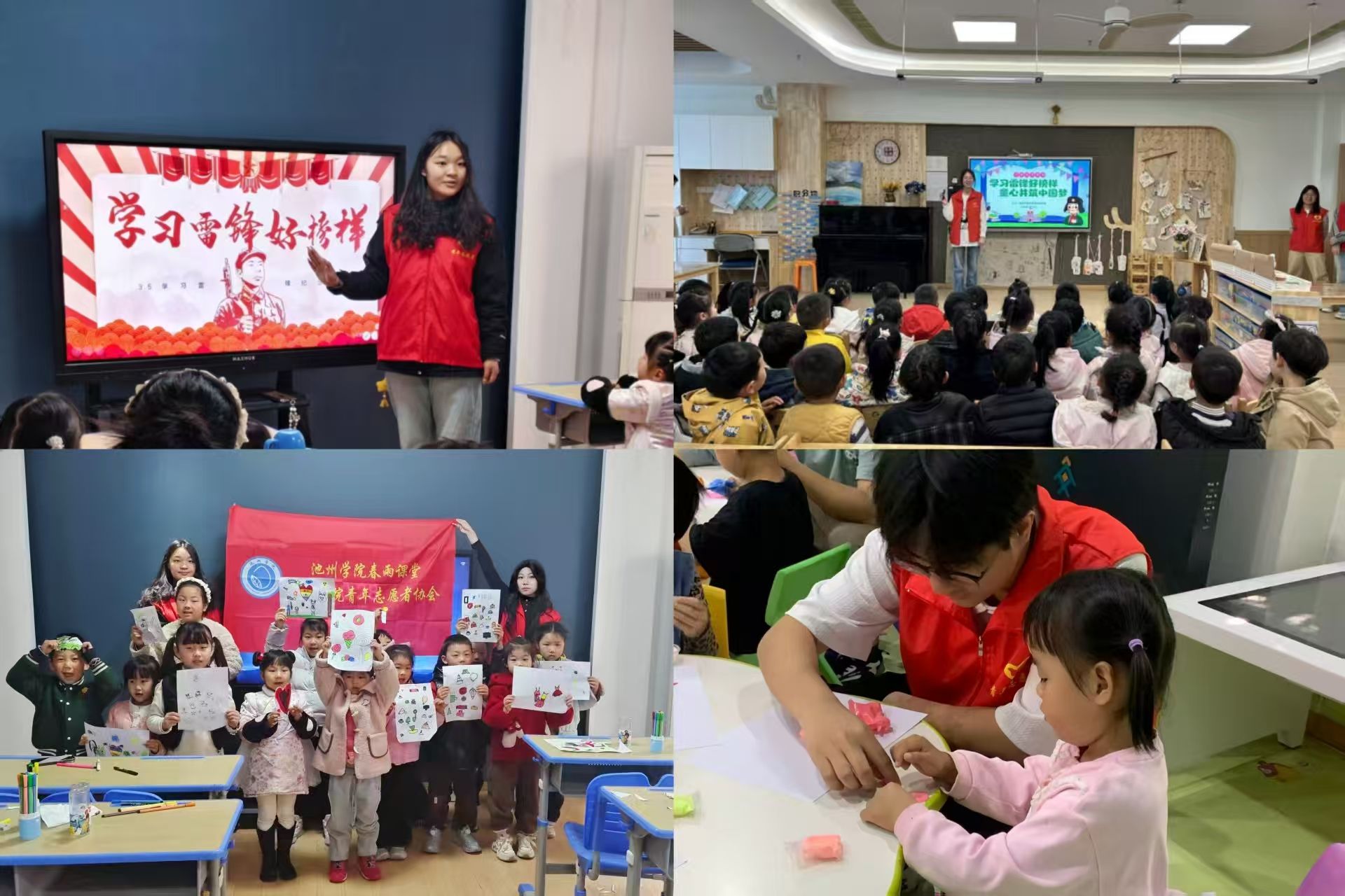 科普启智:播撒科学与精神的种子。“春雨课堂”志愿服务队利用周末深入社区,面向6—8岁儿童开展爱心陪伴志愿服务活动。志愿者们精心开设火烈鸟水粉美术课程,科普动物知识与绘画技法,充分激发儿童的艺术感知力与创作想象力;同步开设雷锋精神主题教育课程,通过讲述雷锋事迹、分享志愿故事、互动交流讨论等形式,引导孩子发现身边善举,践行雷锋精神。此外,外国语学院组织志愿者赴池州市直幼儿教育集团,开展“学习雷锋好榜样 童心共筑中国梦”主题活动。志愿者们以PPT宣讲、趣味游戏等形式,结合专业特色引导幼儿用英语介绍作品,实现专业优势与幼儿启蒙教育深度融合,在童心深处播撒奉献、友善的精神种子。