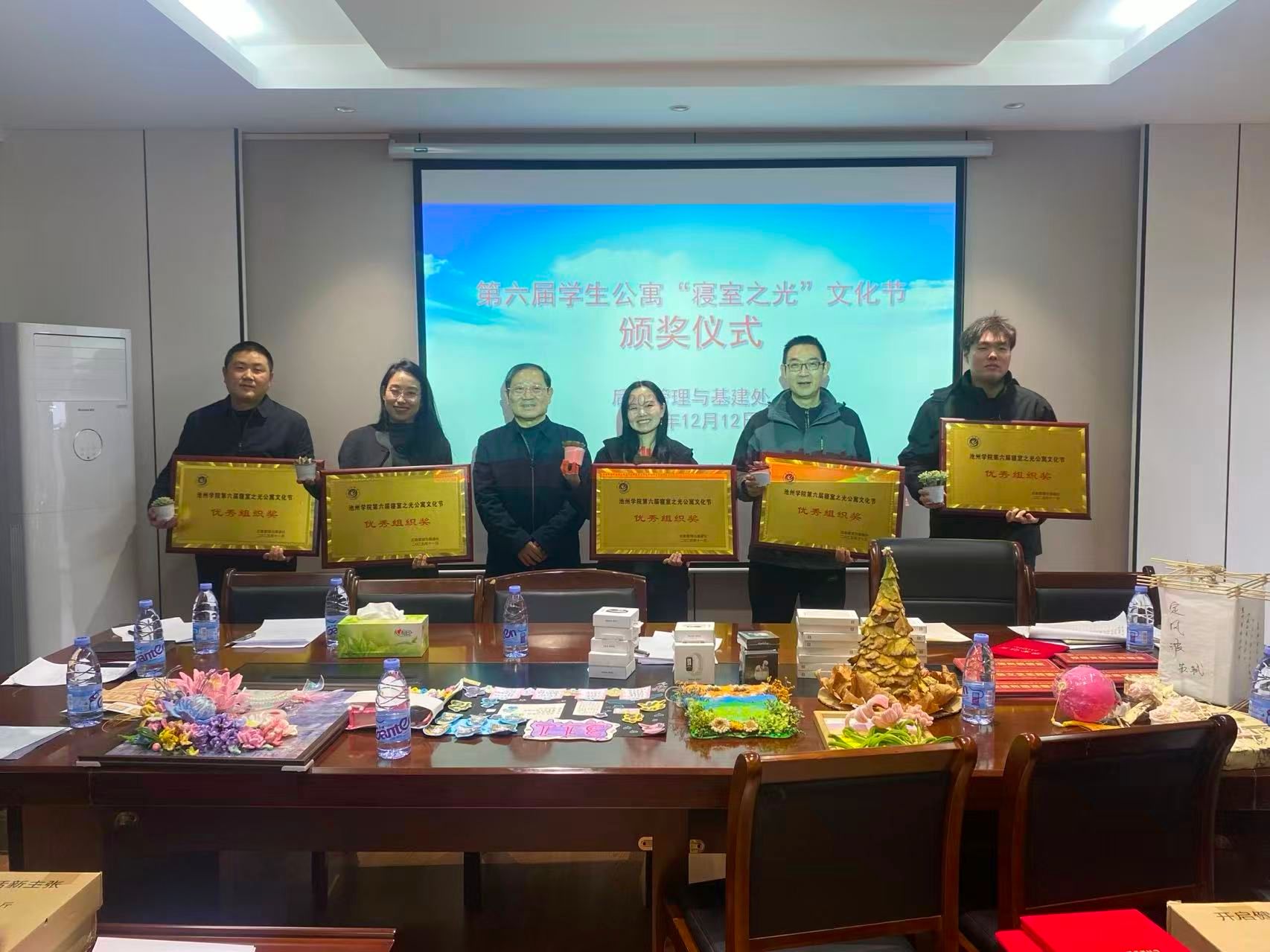 为提升学生文明素养,推进寝室文化建设,营造美好生活空间,学校于2025年11月组织开展了第六届学生公寓“寝室之光”文化艺术节。为总结成果、表彰先进,2025年12月12日下午,颁奖活动在后勤管理与基建处会议室举行。各二级学院分管学生工作副书记、获奖师生代表、宿管员代表等50余人参加。活动由后勤管理与基建处处长张甫彬主持。