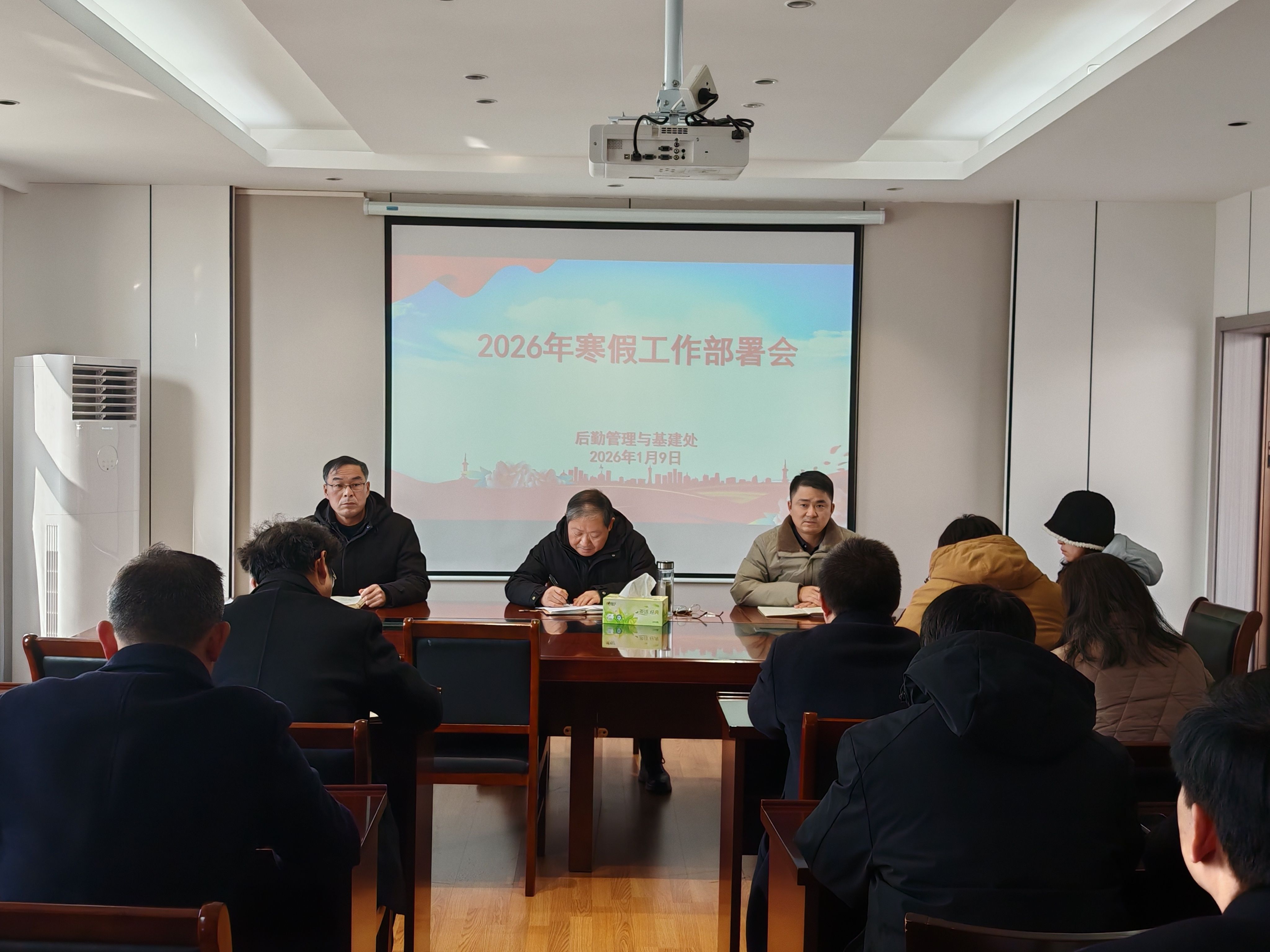 1月9日下午,后勤管理与基建处在处会议室组织召开2026年寒假工作部署会,传达学校相关文件精神,并就寒假前后及新学期初各项重点工作进行安排。后勤管理与基建处班子成员、各科室负责人及各第三方服务企业负责人参会。会议由处长张甫彬主持。